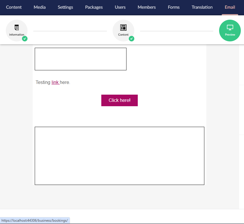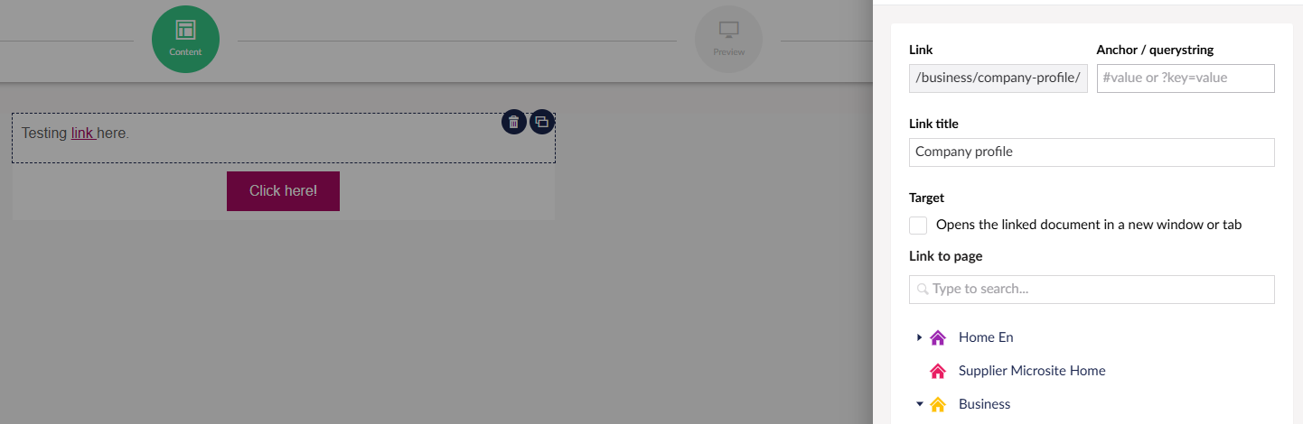 Each time we insert a content page URL in the email body (Content > Text control), it looks correct in the Text control’s code view: