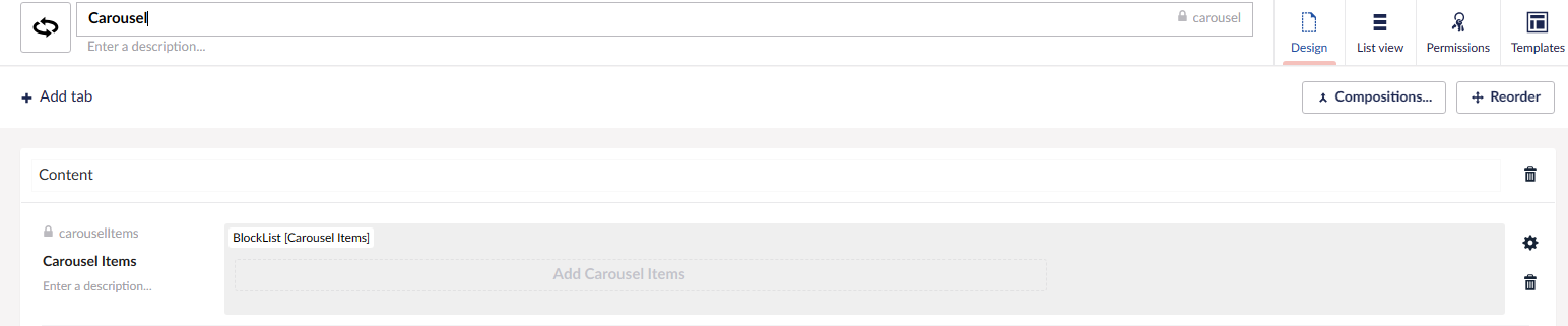 Now i have created i more element type named carousel in which i have 1 property field in which i am using this block list data type