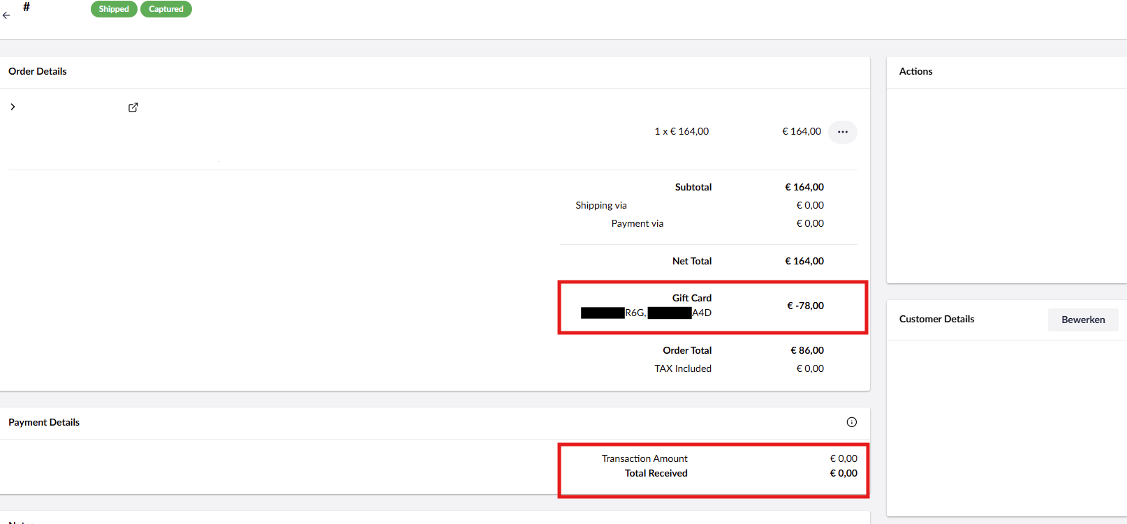 As you can see in the screenshot below, the Net Total is 164 EUR and a total of 78 EUR is deducted from the gift cards, which means there should still be 86 EUR remaining to pay. However, the transaction amount is set to 0 EUR.