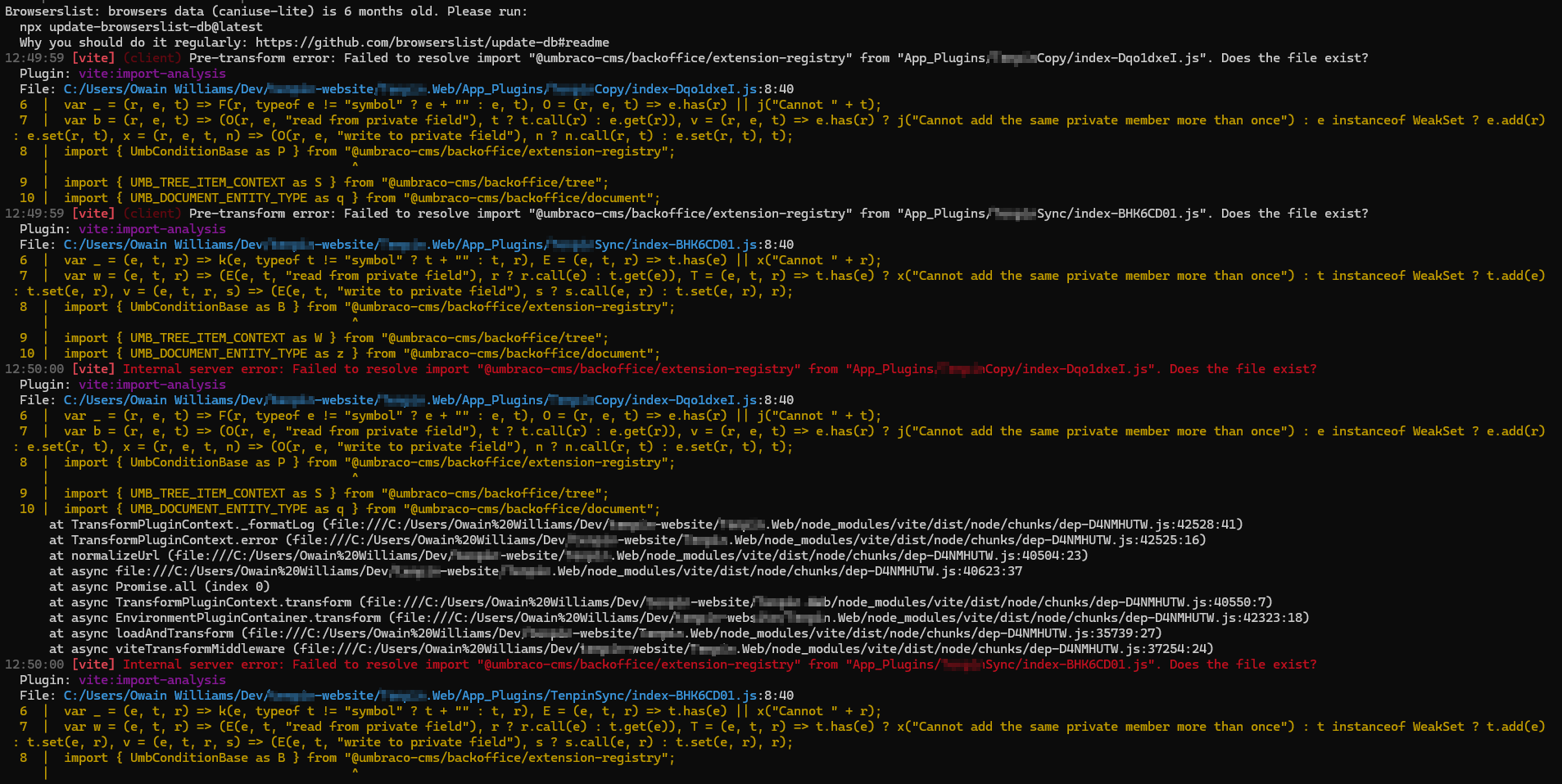 When I do a npm run build on each individual package, I get zero issues, no warnings or errors, but when I run the site locally, I guess something goes on where Umbraco will register the packages. Once I log in to the backoffice, that’s when I get the screen below.