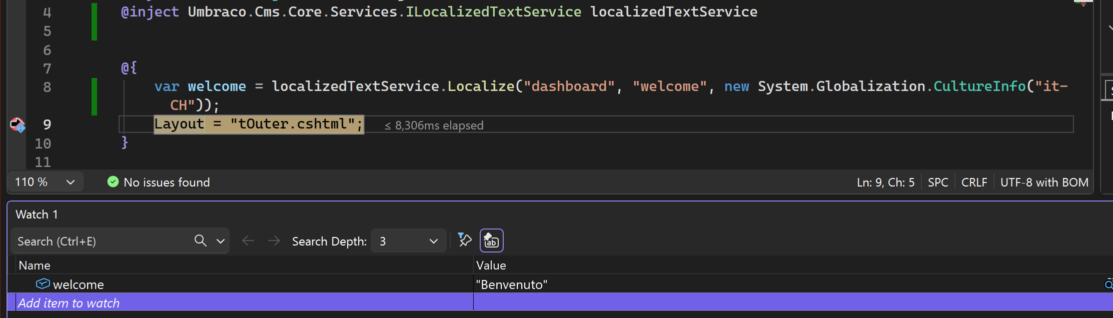 Let’s say, there is a content block called “Log-in Status” that can be added to a Block Grid on a page. The view of this content block “logInStatus.cshtml” displays a welcome message on the front-end such as “Welcome, {user name}” where “Welcome” should be translated into different languages supported by the package and if the language is not supported, the translation label can still be added by the user. For example, in French it will be “Bienvenue, {user name}”.