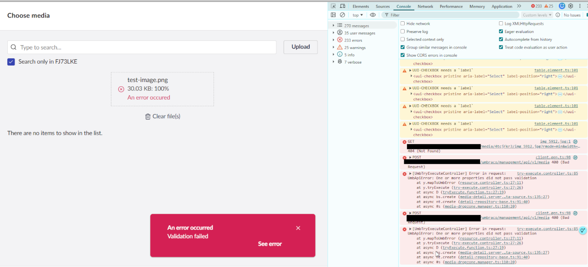 No errors are logged (nothing in Log viewer or the umbraco Log file). All I have to go on is the errors in the console which are not descriptive.