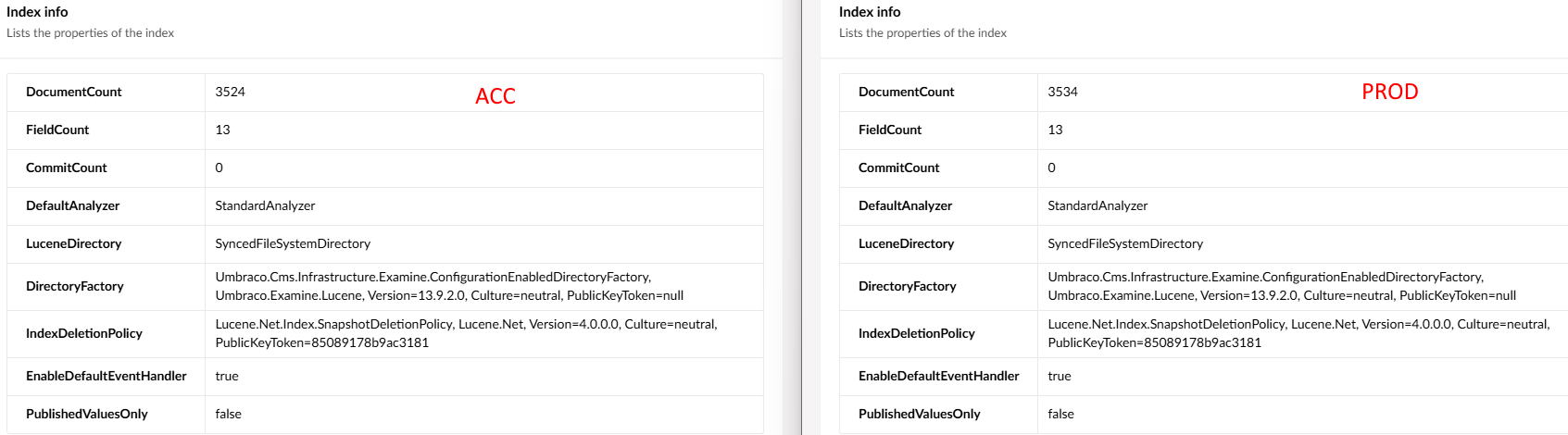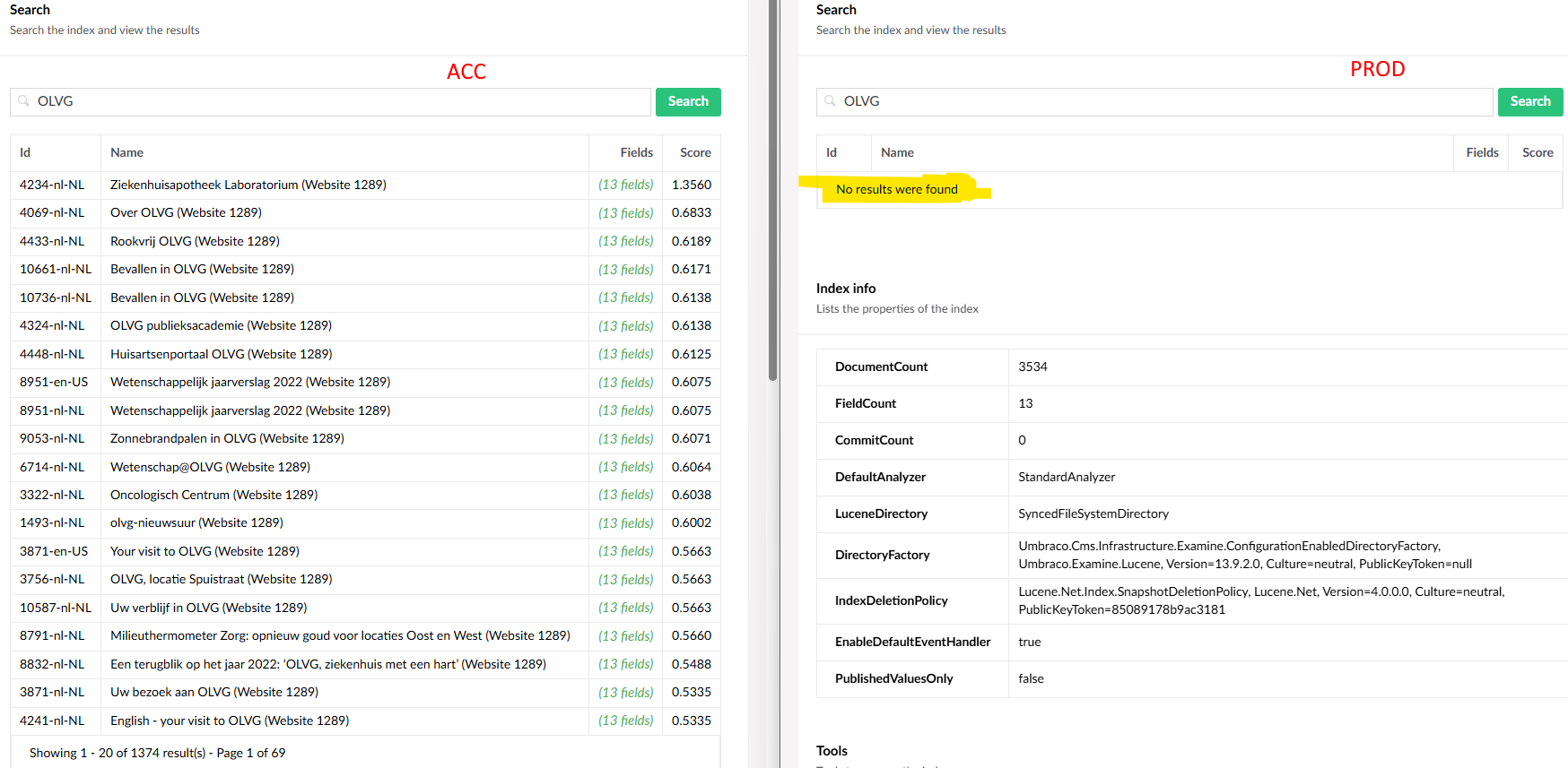 When I look at the index on the acceptance and production environment, they are practically the same, have the same analyzer, same LuceneDirectory etc: