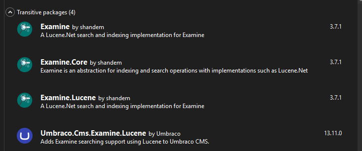Sadly I don’t think it will be that as we have been running latest and greatest Umbraco for a while. I know 13.12 has arrived just recently, but looking at what is installed for Examine we have: