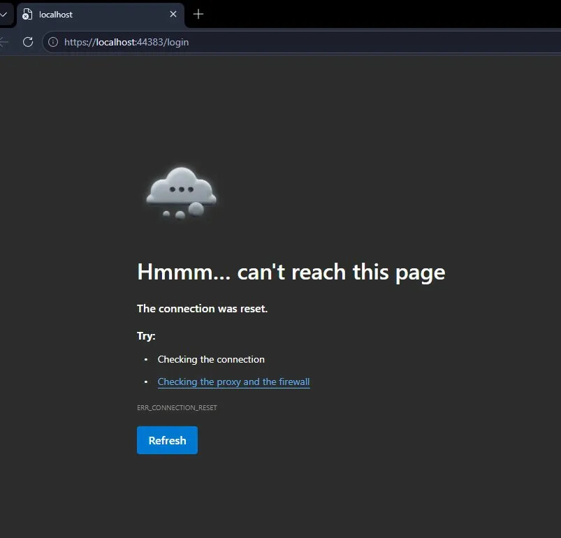 IIS Express uses its own self-signed cert, and if itâs expired or untrusted it kills the connection before the browser even gets a response. Run this in an elevated command prompt: