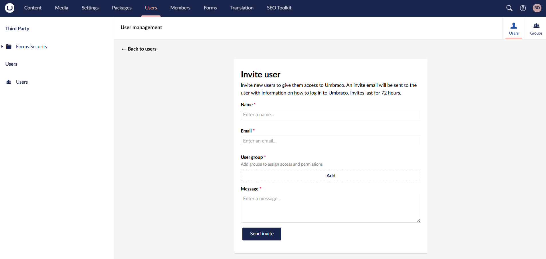 Im using umbraco v13.8.1 and trying to invite an user via the backoffice.