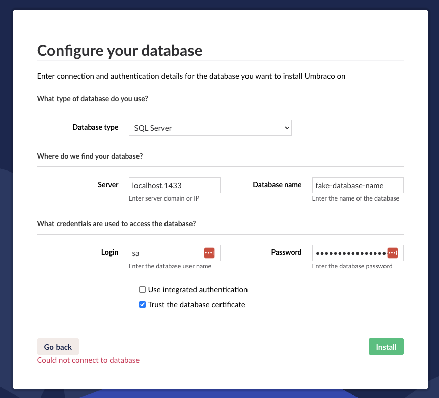 I’m new to Umbraco and am trying install a local version of Umbraco 12 on my Mac. I’m able to launch the project in my browser and bring up the Umbraco installation screen. I’m attempting to connect to SQL Server running inside a Docker container. However I’m not able to connect to the database. I keep getting a “Could not connect to database” message.