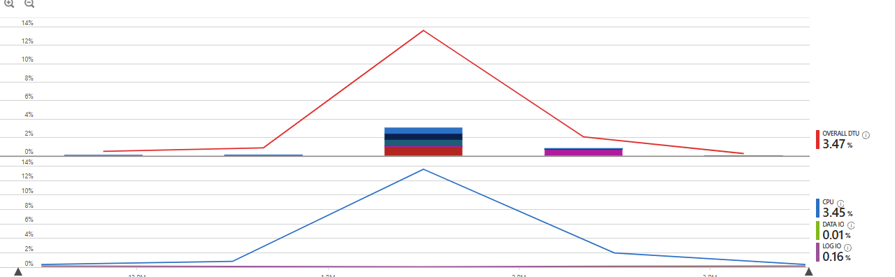 We can almost perfectly map the spikes in the App Service metrics to the DTU usage on the separately hosted Azure database (which is only used by Commerce).