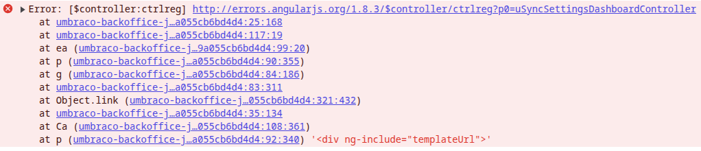 When I try to access uSync, I get a blank pane where the dashboard should be and this in the console..