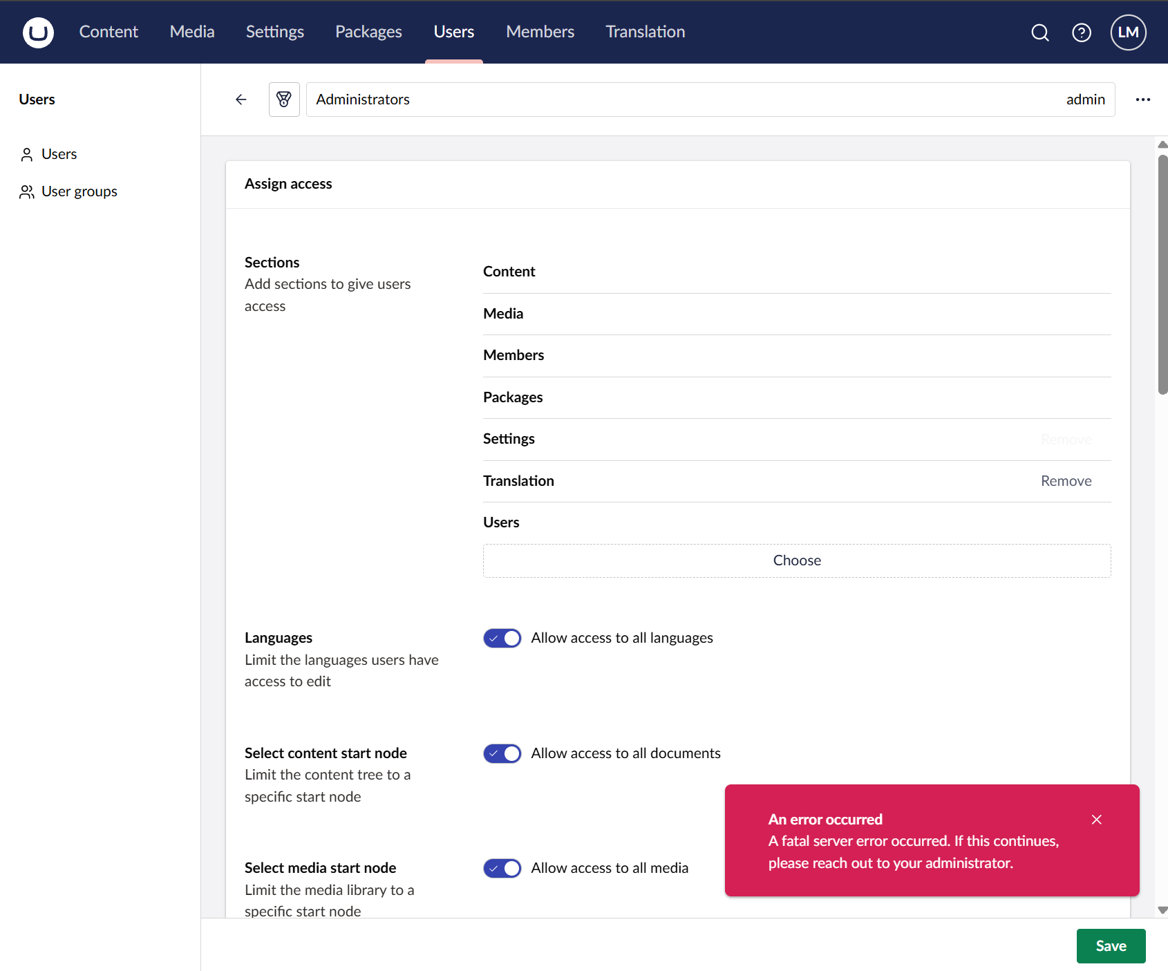 Anyone seen this issue before, I have installed a new Umbraco 17 install on a server, all seems fine, can login, click around, create a content type etc… I just can’t save a user group or user? I get