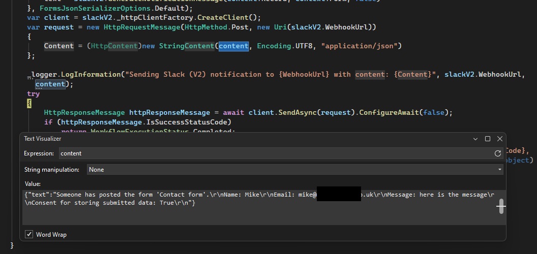 Is the forms data coming through as json to the Slack webhook? I created “Data Variables” in the webhook, but the obvious options don’t seem to be working (name, message, etc). What does the HTTP body for the post from Umbraco Forms look like?