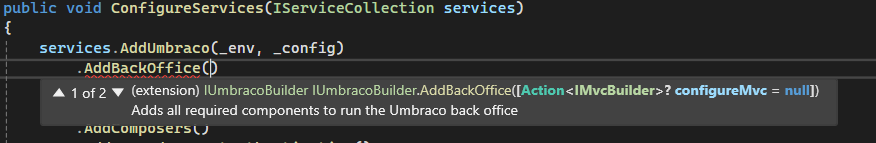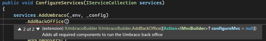 ‘Umbraco.Extensions.UmbracoBuilderExtensions.AddBackOffice(Umbraco.Cms.Core.DependencyInjection.IUmbracoBuilder, System.Action<Microsoft.Extensions.DependencyInjection.IMvcBuilder>?)’