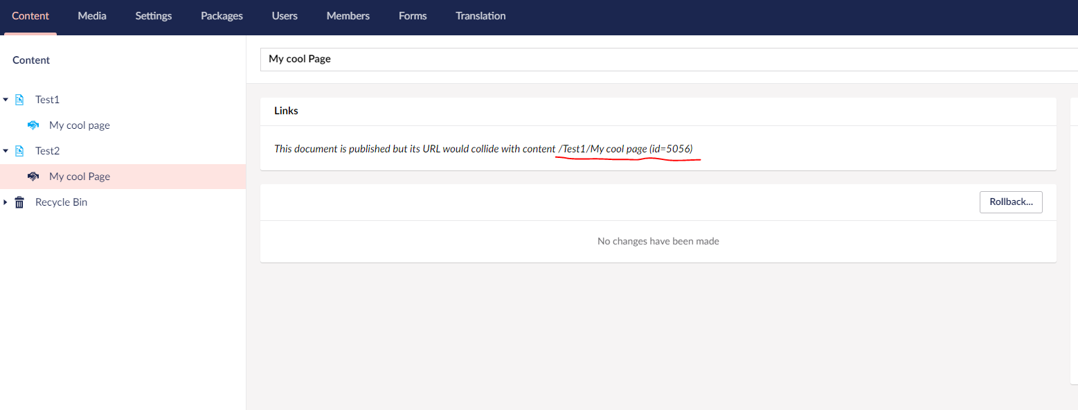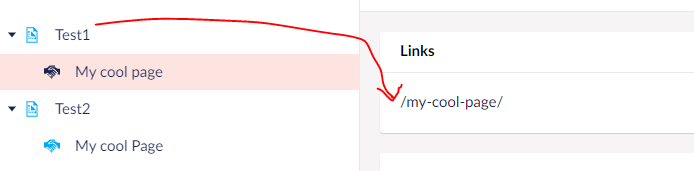 And as I can see in the other content item I added from parent Test1 I added intentionally the other item named the same: My cool page.