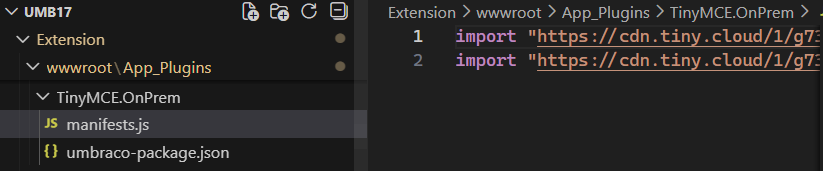 We have registered the TinyMce in the Extension project’s wwwroot/App_Plugins folder