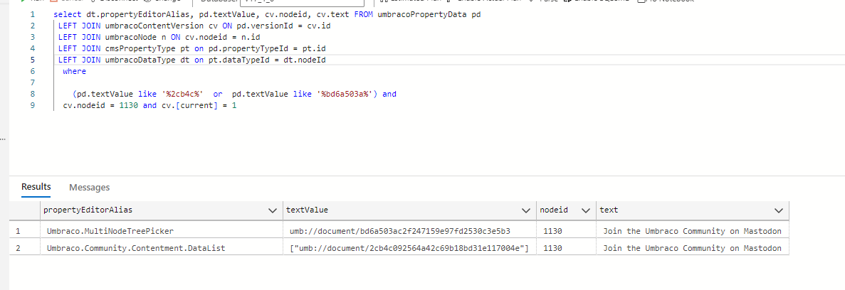 select dt.propertyEditorAlias, pd.textValue, cv.nodeid, cv.text FROM umbracoPropertyData pd