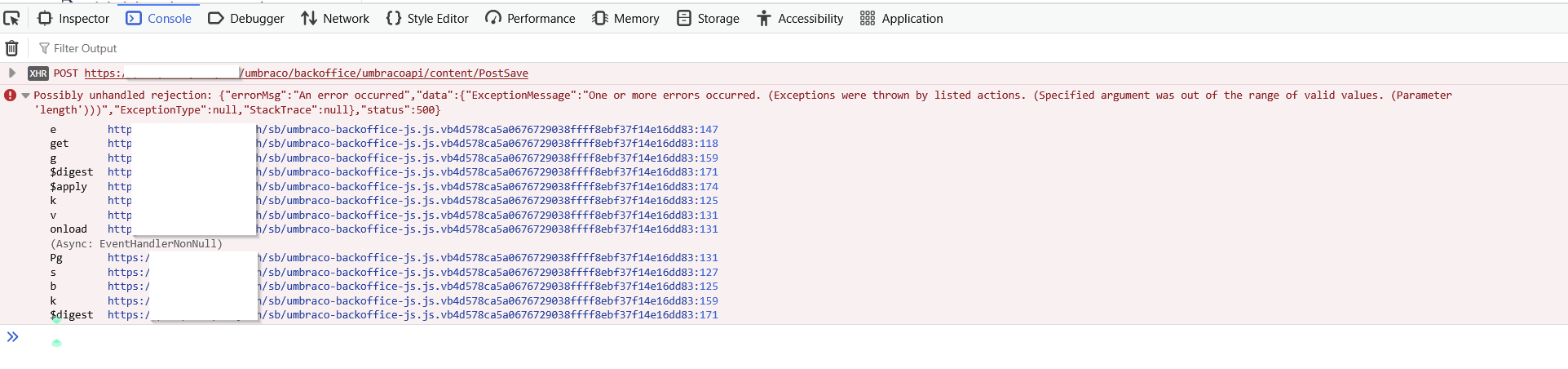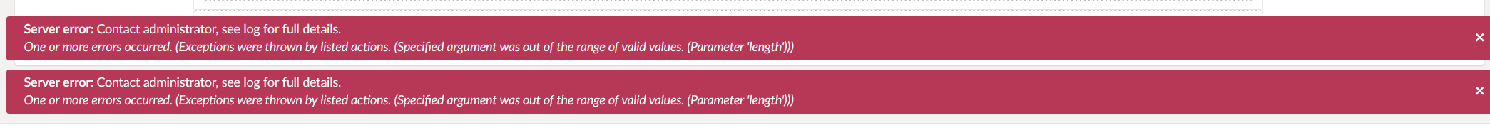 Possibly unhandled rejection: {"errorMsg":"An error occurred","data":{"ExceptionMessage":"One or more errors occurred. (Exceptions were thrown by listed actions. (Specified argument was out of the range of valid values. (Parameter 'length')))","ExceptionType":null,"StackTrace":null},"status":500}