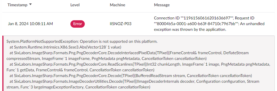 We can see that if we request the path /Images/2712119.png?width=500&mode=crop&format=webp&quality=85 we get a 500 error returned and the following entry appears in the logs.