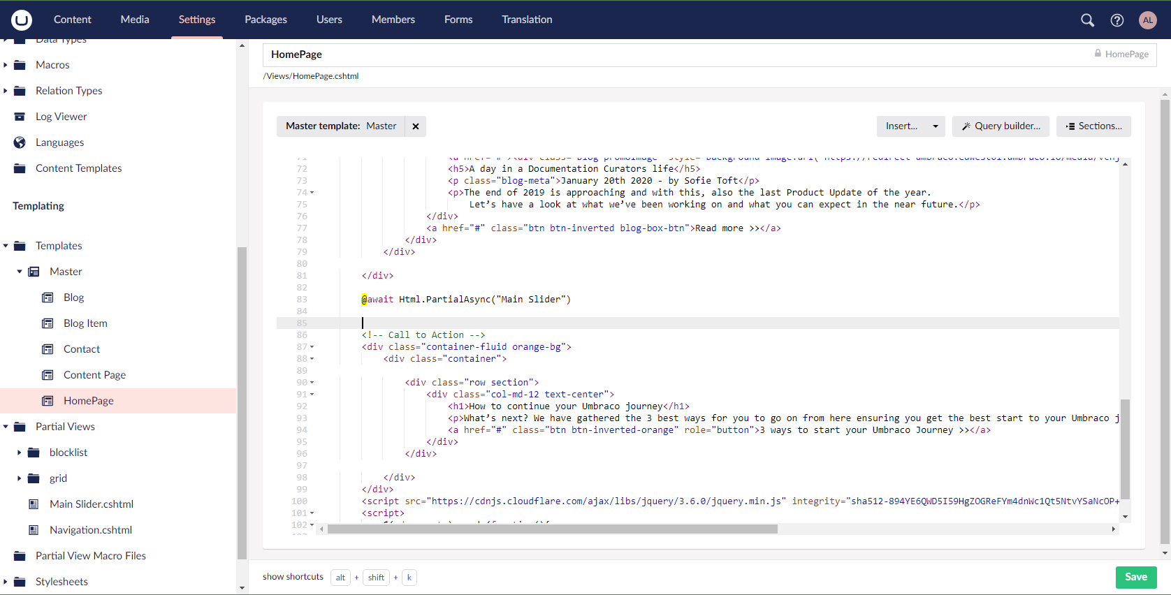 Finally I inserted the Partial View into my Homepage template (line 83).