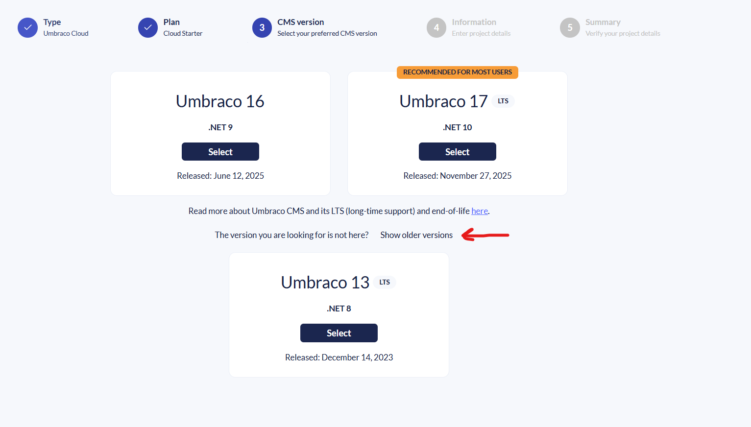 Is there a way to specify the version of Umbraco I want the site to use when creating a cloud site, I can’t see any thing in the docs to say there is.