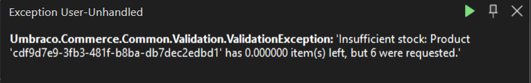 I have got a umbraco commerce site and the system I am integrating it allows for items to be backordered. However, if I try to add an item to the basket using await order.AddProductAsync(ProductRef, ProductVariantReference, Quantity)on a product with no stock, it throws the following error