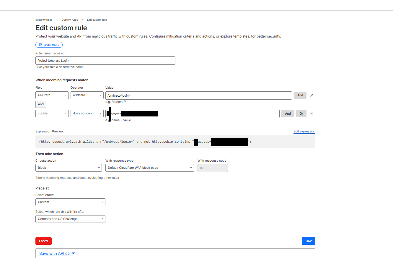 Instead I use Cloudflare’s block on the login route. Editors need a special cookie to access the login.