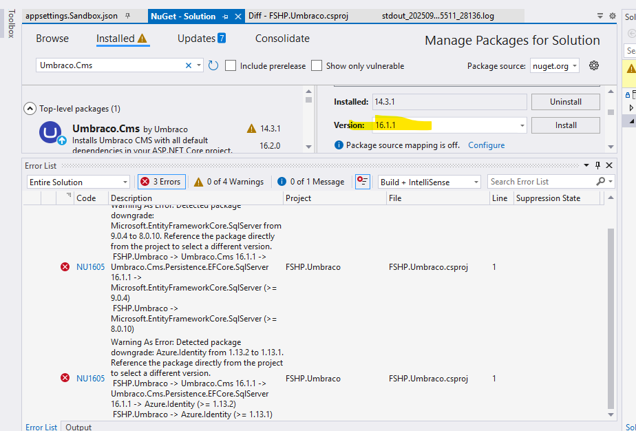 I am in the process of upgrading our Umbraco instance from version 14.3.1 (which contains known vulnerabilities) to the latest stable release 16.2.0. As part of this upgrade, I have also updated the project’s .NET version from 8 to 9 to meet the requirements of Umbraco 16.