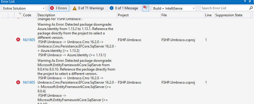 After these changes, there are no build errors, but the solution is still not running. This issue started occurring only after the Umbraco upgrade.