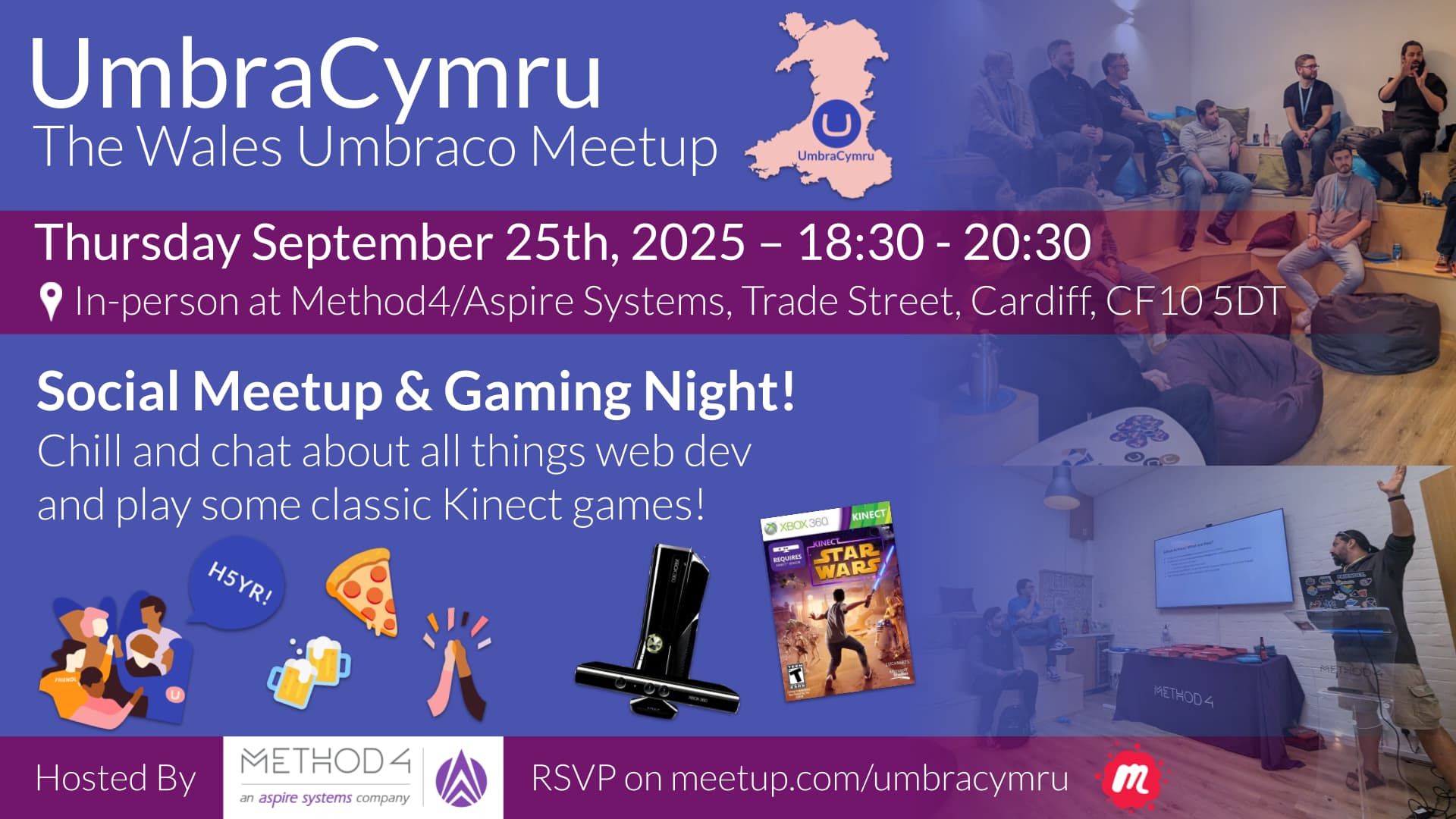 Take a break from the code and come hang out with the Umbraco community in Cardiff, for a laid-back evening to chat about all things web dev, share ideas, and enjoy some friendly gaming action with Kinect classics!