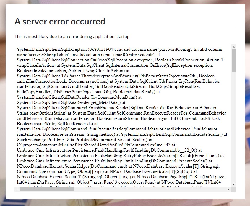1 wrapCloseInAction) at System.Data.SqlClient.SqlInternalConnection.OnError(SqlException exception, Boolean breakConnection, Action1 wrapCloseInAction) at System.Data.SqlClient.TdsParser.ThrowExceptionAndWarning(TdsParserStateObject stateObj, Boolean callerHasConnectionLock, Boolean asyncClose) at System.Data.SqlClient.TdsParser.TryRun(RunBehavior runBehavior, SqlCommand cmdHandler, SqlDataReader dataStream, BulkCopySimpleResultSet bulkCopyHandler, TdsParserStateObject stateObj, Boolean& dataReady) at System.Data.SqlClient.SqlDataReader.TryConsumeMetaData() at System.Data.SqlClient.SqlDataReader.get_MetaData() at System.Data.SqlClient.SqlCommand.FinishExecuteReader(SqlDataReader ds, RunBehavior runBehavior, String resetOptionsString) at System.Data.SqlClient.SqlCommand.RunExecuteReaderTds(CommandBehavior cmdBehavior, RunBehavior runBehavior, Boolean returnStream, Boolean async, Int32 timeout, Task& task, Boolean asyncWrite, SqlDataReader ds) at System.Data.SqlClient.SqlCommand.RunExecuteReader(CommandBehavior cmdBehavior, RunBehavior runBehavior, Boolean returnStream, String method) at System.Data.SqlClient.SqlCommand.ExecuteScalar() at StackExchange.Profiling.Data.ProfiledDbCommand.ExecuteScalar() in C:\projects\dotnet\src\MiniProfiler.Shared\Data\ProfiledDbCommand.cs:line 343 at Umbraco.Cms.Infrastructure.Persistence.FaultHandling.FaultHandlingDbCommand.b__32_0() at Umbraco.Cms.Infrastructure.Persistence.FaultHandling.RetryPolicy.ExecuteAction[TResult](Func1 func) at Umbraco.Cms.Infrastructure.Persistence.FaultHandling.FaultHandlingDbCommand.ExecuteScalar() at NPoco.Database.ExecuteScalarHelper(DbCommand cmd) at NPoco.Database.ExecuteScalar[T](String sql, CommandType commandType, Object[] args) at NPoco.Database.ExecuteScalar[T](Sql Sql) at NPoco.Database.ExecuteScalar[T](String sql, Object[] args) at NPoco.Database.PageImp[T,TRet](Int64 page, Int64 itemsPerPage, String sql, Object[] args, Func3 executeQueryFunc) at NPoco.Database.Page[T](Int64 page, Int64 itemsPerPage, String sql, Object args) at NPoco.Database.Page[T](Int64 page, Int64 itemsPerPage, Sql sql) at Umbraco.Cms.Infrastructure.Persistence.Repositories.Implement.ContentRepositoryBase3.GetPage[TDto](IQuery1 query, Int64 pageIndex, Int32 pageSize, Int64& totalRecords, Func2 mapDtos, Sql1 filter, Ordering ordering) at Umbraco.Cms.Infrastructure.Persistence.Repositories.Implement.MemberRepository.GetPage(IQuery1 query, Int64 pageIndex, Int32 pageSize, Int64& totalRecords, IQuery1 filter, Ordering ordering) at Umbraco.Cms.Infrastructure.PublishedCache.Persistence.NuCacheContentRepository.RebuildMemberDbCache(IContentCacheDataSerializer serializer, Int32 groupSize, IReadOnlyCollection1 contentTypeIds) at Umbraco.Cms.Infrastructure.PublishedCache.Persistence.NuCacheContentRepository.Rebuild(IReadOnlyCollection1 contentTypeIds, IReadOnlyCollection1 mediaTypeIds, IReadOnlyCollection1 memberTypeIds) at Umbraco.Cms.Infrastructure.PublishedCache.Persistence.NuCacheContentService.Rebuild(IReadOnlyCollection1 contentTypeIds, IReadOnlyCollection1 mediaTypeIds, IReadOnlyCollection1 memberTypeIds) at Umbraco.Cms.Infrastructure.PublishedCache.Persistence.NuCacheContentService.RebuildDatabaseCacheIfSerializerChanged() at Umbraco.Cms.Infrastructure.PublishedCache.NuCacheStartupHandler.Handle(UmbracoApplicationStartingNotification notification) at Umbraco.Cms.Core.Events.EventAggregator.PublishCore(IEnumerable1 allHandlers, INotification notification) at Umbraco.Cms.Core.Events.EventAggregator.PublishAsync[TNotification](TNotification notification, CancellationToken cancellationToken) at Umbraco.Cms.Infrastructure.Runtime.CoreRuntime.StartAsync(CancellationToken cancellationToken) at Umbraco.Cms.Infrastructure.Runtime.CoreRuntime.RestartAsync() at Umbraco.Cms.Web.BackOffice.Install.InstallApiController.CompleteInstall() at lambda_method519(Closure , Object ) at Microsoft.AspNetCore.Mvc.Infrastructure.ActionMethodExecutor.TaskOfActionResultExecutor.Execute(IActionResultTypeMapper mapper, ObjectMethodExecutor executor, Object controller, Object arguments) at Microsoft.AspNetCore.Mvc.Infrastructure.ControllerActionInvoker.g__Awaited|12_0(ControllerActionInvoker invoker, ValueTask`1 actionResultValueTask) at Microsoft.AspNetCore.Mvc.Infrastructure.ControllerActionInvoker.g__Awaited|10_0(ControllerActionInvoker invoker, Task lastTask, State next, Scope scope, Object state, Boolean isCompleted) at Microsoft.AspNetCore.Mvc.Infrastructure.ControllerActionInvoker.Rethrow(ActionExecutedContextSealed context) at Microsoft.AspNetCore.Mvc.Infrastructure.ControllerActionInvoker.Next(State& next, Scope& scope, Object& state, Boolean& isCompleted) at Microsoft.AspNetCore.Mvc.Infrastructure.ControllerActionInvoker.InvokeInnerFilterAsync() — End of stack trace from previous location — at Microsoft.AspNetCore.Mvc.Infrastructure.ResourceInvoker.g__Awaited|24_0(ResourceInvoker invoker, Task lastTask, State next, Scope scope, Object state, Boolean isCompleted) at Microsoft.AspNetCore.Mvc.Infrastructure.ResourceInvoker.Rethrow(ResourceExecutedContextSealed context) at Microsoft.AspNetCore.Mvc.Infrastructure.ResourceInvoker.Next(State& next, Scope& scope, Object& state, Boolean& isCompleted) at Microsoft.AspNetCore.Mvc.Infrastructure.ResourceInvoker.InvokeFilterPipelineAsync() — End of stack trace from previous location — at Microsoft.AspNetCore.Mvc.Infrastructure.ResourceInvoker.g__Awaited|17_0(ResourceInvoker invoker, Task task, IDisposable scope) at Microsoft.AspNetCore.Routing.EndpointMiddleware.g__AwaitRequestTask|6_0(Endpoint endpoint, Task requestTask, ILogger logger) at Umbraco.Cms.Web.Common.Middleware.BasicAuthenticationMiddleware.InvokeAsync(HttpContext context, RequestDelegate next) at Microsoft.AspNetCore.Builder.UseMiddlewareExtensions.<>c__DisplayClass6_1.<b__1>d.MoveNext() — End of stack trace from previous location — at Umbraco.Cms.Web.BackOffice.Middleware.BackOfficeExternalLoginProviderErrorMiddleware.InvokeAsync(HttpContext context, Req