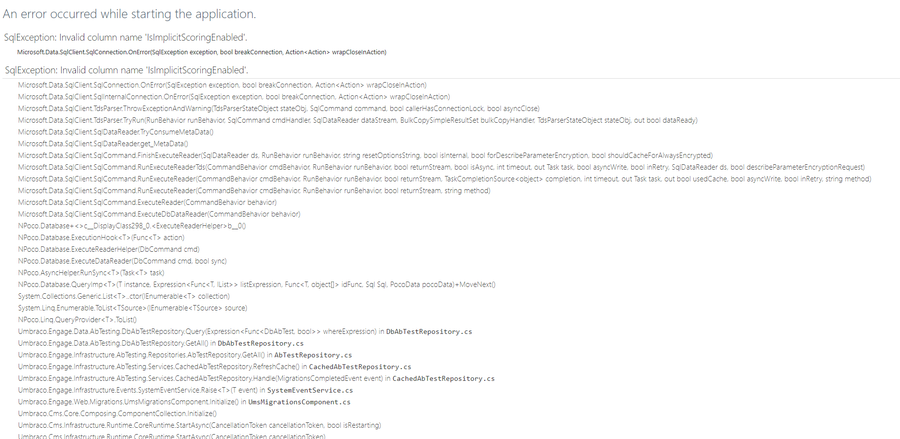 Microsoft.Data.SqlClient.SqlException (0x80131904): Invalid column name 'IsImplicitScoringEnabled'.