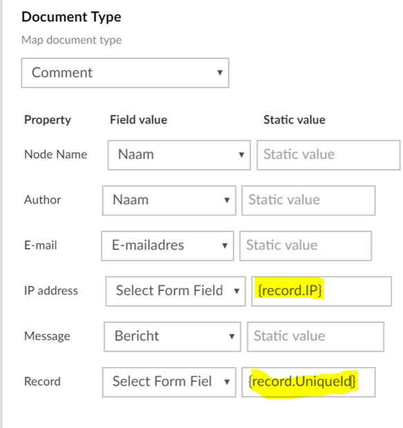 {record.IP}to get the IP address of the website visitor => this works{record.UniqueId}to link the document with the original forms record => this doesn’t work
