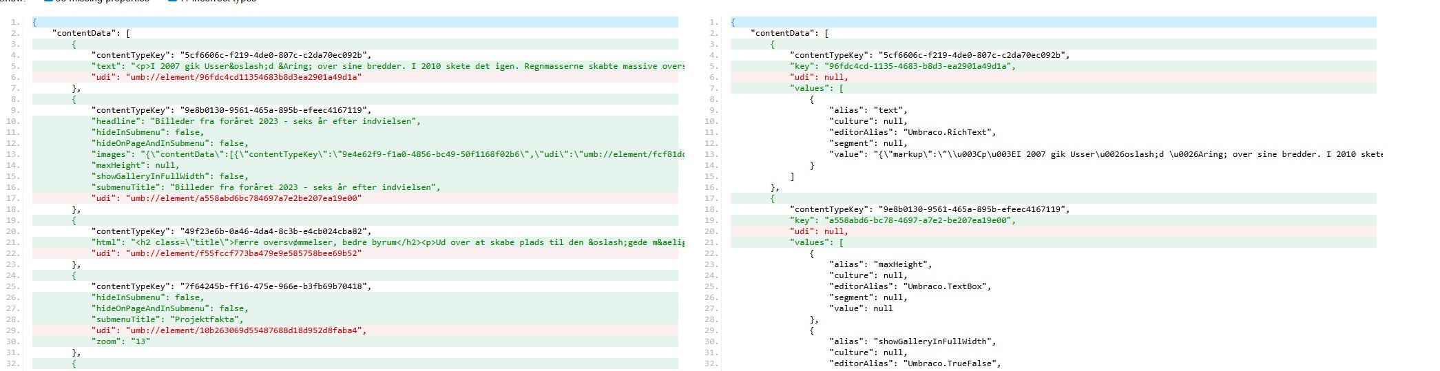 My import on the left and the stored umbraco content after a manual save and publish on the right. I have not posted the entire json as they are pretty large.