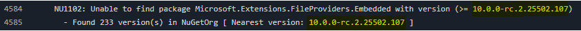 Unable to find package Microsoft.Extensions.FileProviders.Embedded. No packages exist with this id in source(s): Microsoft Visual Studio Offline Packages, nuget.org